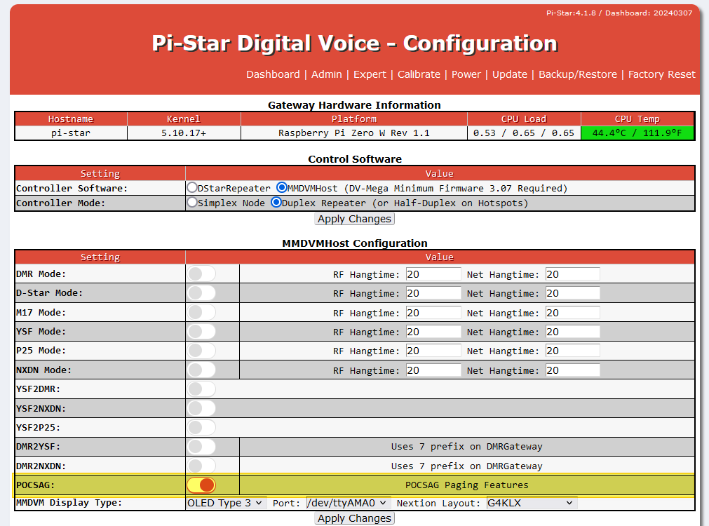 In der Konfiguration vom pi-star muss zuerst POCSAG aktiviert werden.